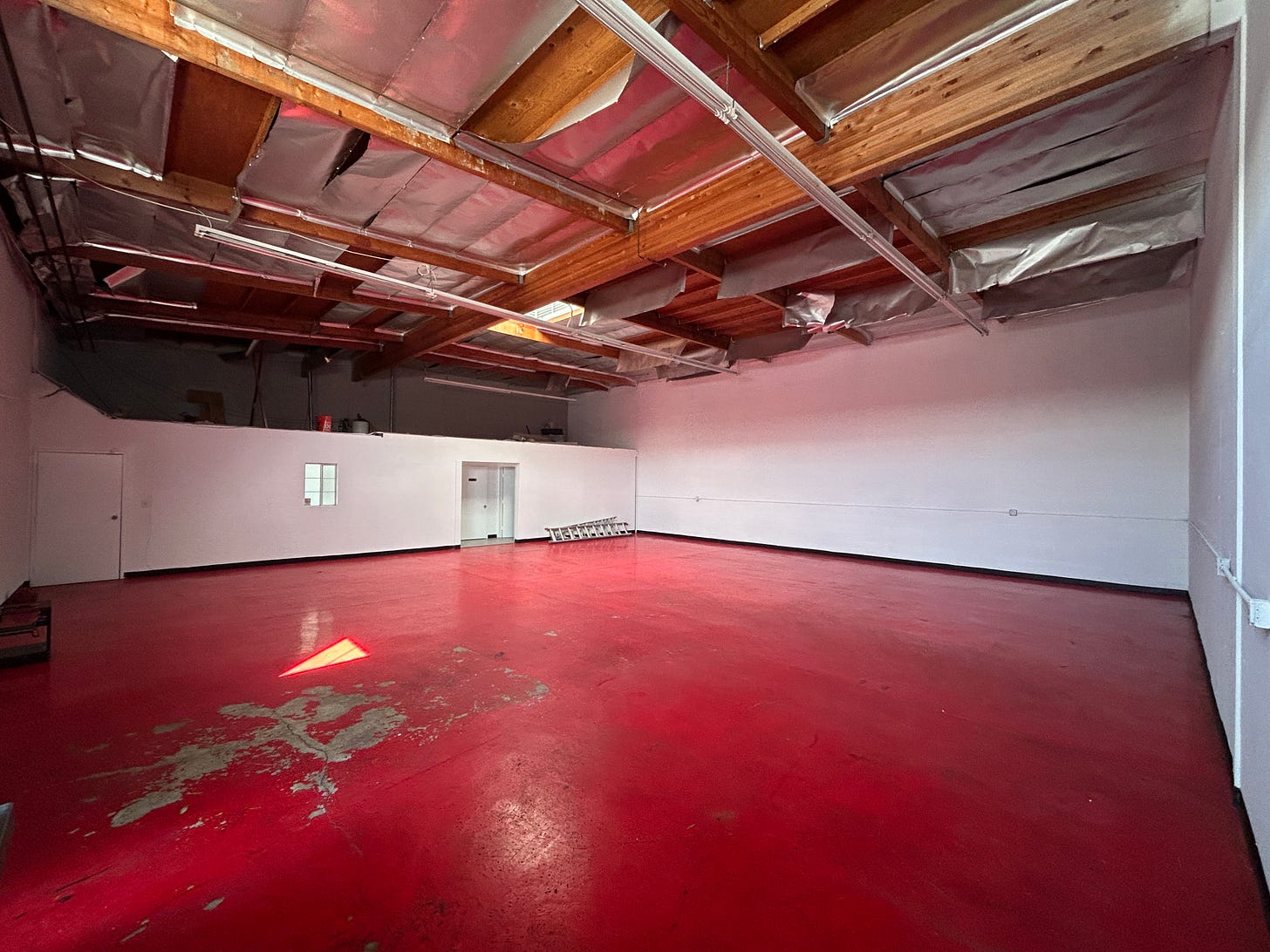An actual photo of our warehouse the day we moved in! Though unorthodox, those red floors have really grown on us (…or at least one of us…).